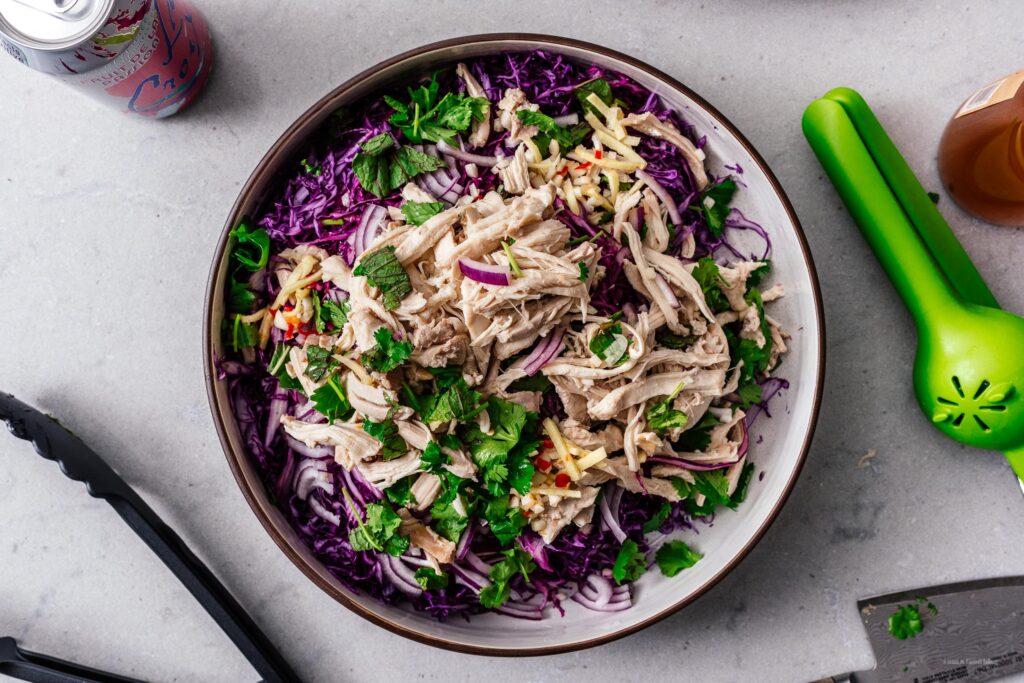 - In a large platter or salad bowl, combine your cabbage, onion, mint, cilantro, and shredded chicken. Top with the dressing, and then toss well. Top with your cubed avocado(es) before serving.