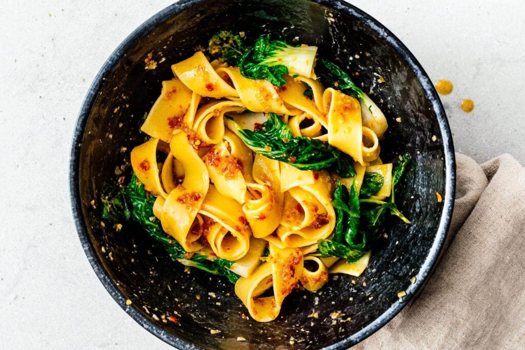 The luxuriousness of the butter with the spiciness and herbaceousness of the chili oil was so good I could have just slurped it up with a spoon. Add in some chewy toothsome noodles for the sauce to cling to and a hit of freshness from herbs and you have the perfect weeknight spicy noodles recipe!