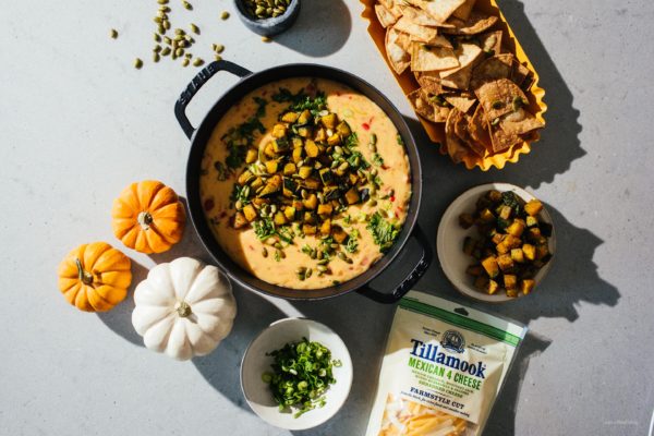 Warm and gooey queso made with Tillamook Farmstyle Cut Mexican 4 Shredded Cheese and a hidden layer of pork and beef picadillo, topped off with roasted kabocha pumpkin cubes and pepitas. Cheese pull city, here we come!
