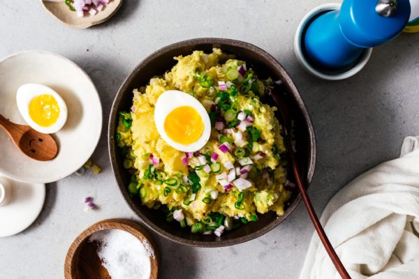Make this classic perfect picnic potato salad and bring it to ever summer gathering! Creamy potatoes, crunchy celery, onions, and eggs combine into a salad youโll be making and eating over and over again thanks to a secret ingredient: rice vinegar for tang.