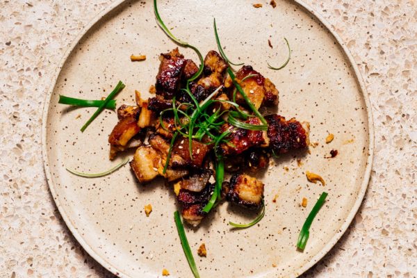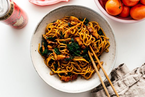These pork belly and kale noodles hit all the right notes: sweet and savory noodles, smoky crisp pork belly, and kale for health.