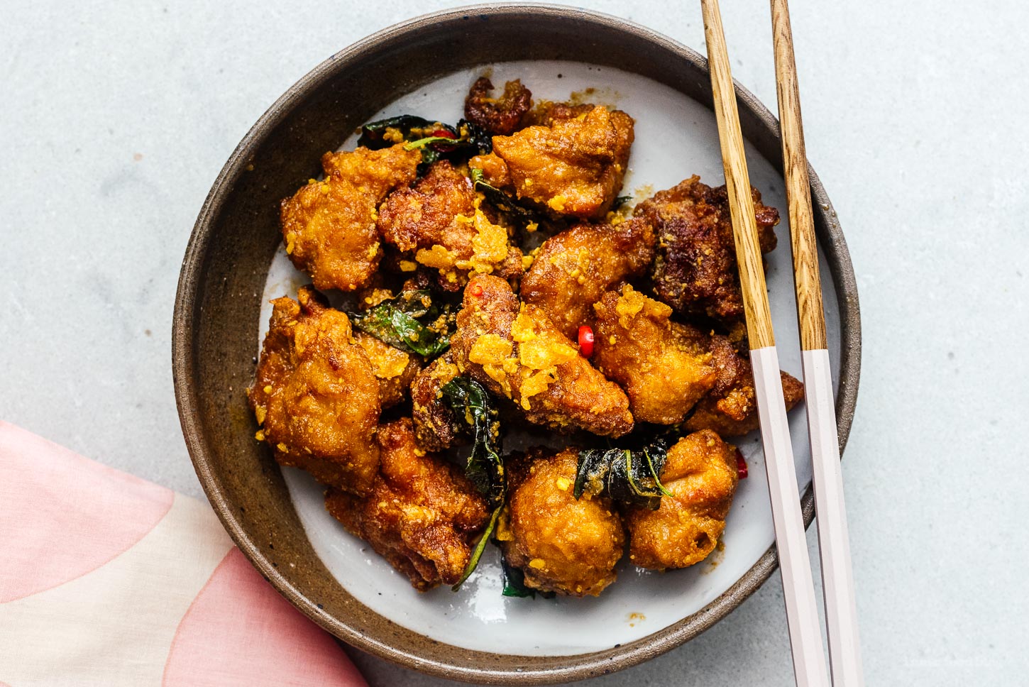 - Make the sauce. In a pan, melt some butter over very low heat. When it’s all melted, add the crumbled salted egg yolks and stir. The butter and egg yolks will bubble up. Stir in some chopped chilis (if using), a pinch of sugar, and some curry or Thai basil leaves. Add in the fried chicken and toss to coat. Time to eat!