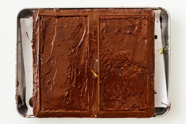 - Gently remelt the chocolate then evenly pour over the filling, using an offset spatula to spread evenly. Place the chocolate bars in the fridge or freezer to set completely.