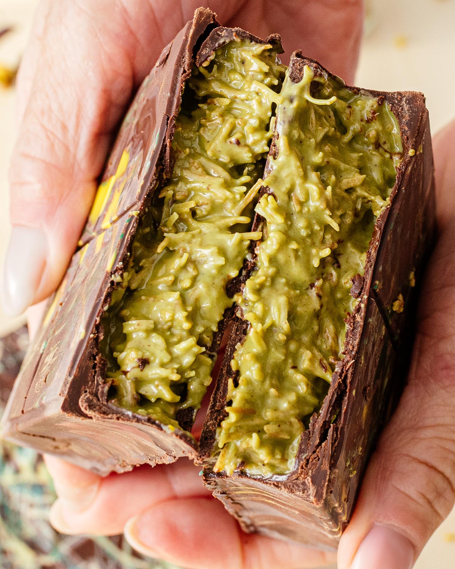- Interior – the insides of a Dubai chocolate bar are a creamy pistachio green with visible strands of crispy kadyif. Breaking into a Dubai chocolate bar is an experience: you get the classic look of a standard chocolate bar on the outside with a unique texture and flavor on the inside.