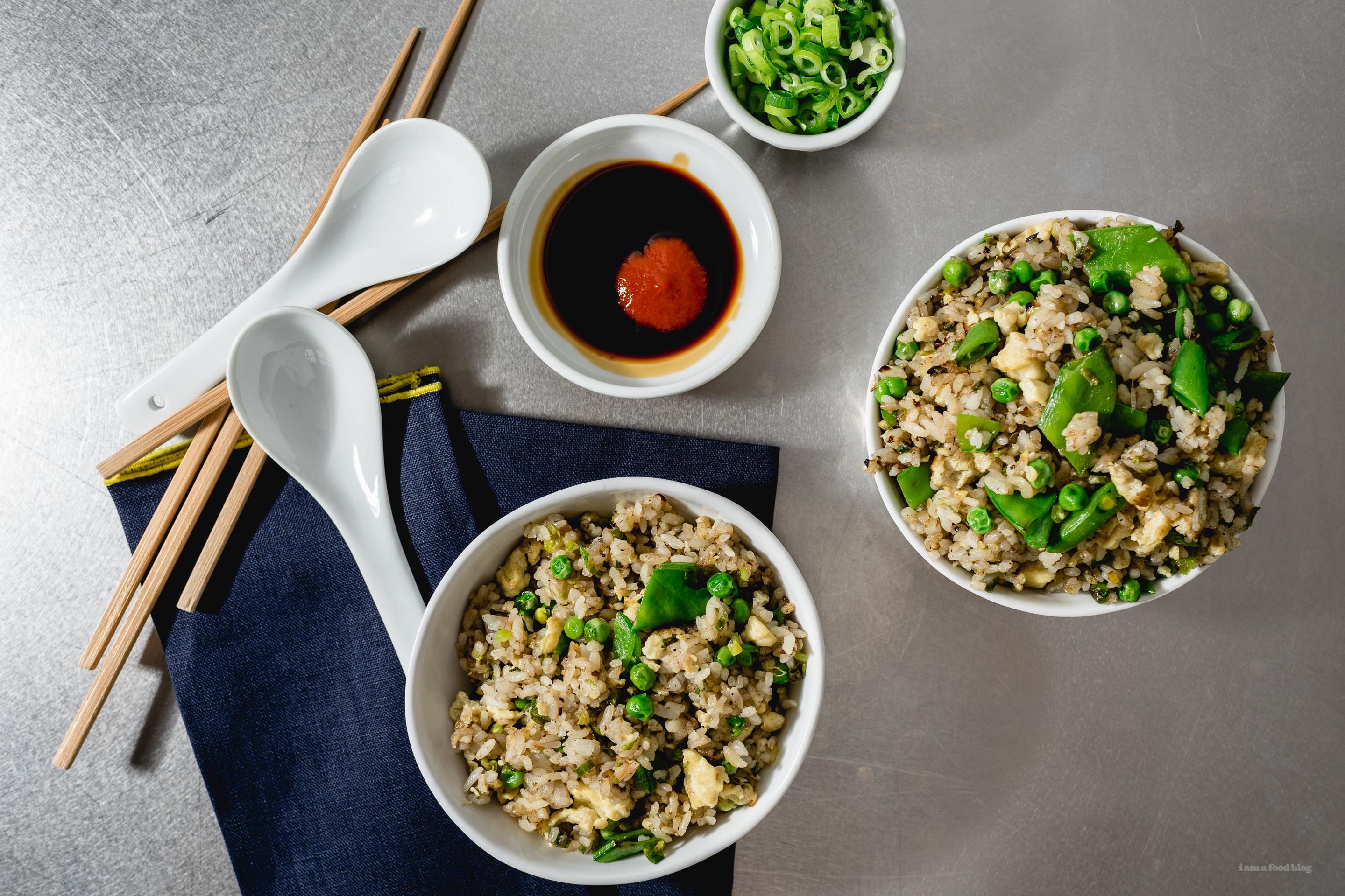 If the skillet is dry, add a tiny bit more oil and then add the shallot and garlic, stirring until fragrant, but not brown, about 30 seconds to a minute. Add the snap peas and snow peas and cook, stirring, until bright green and crisp, 2 minutes max. Remove and set aside. Heat up a bit of oil if needed, then add the rice – if you’re using rice from the fridge, it’s best to break it up with slightly wet hands before putting in the pan. Fry, stirring occasionally until the rice is crispy and heated through.