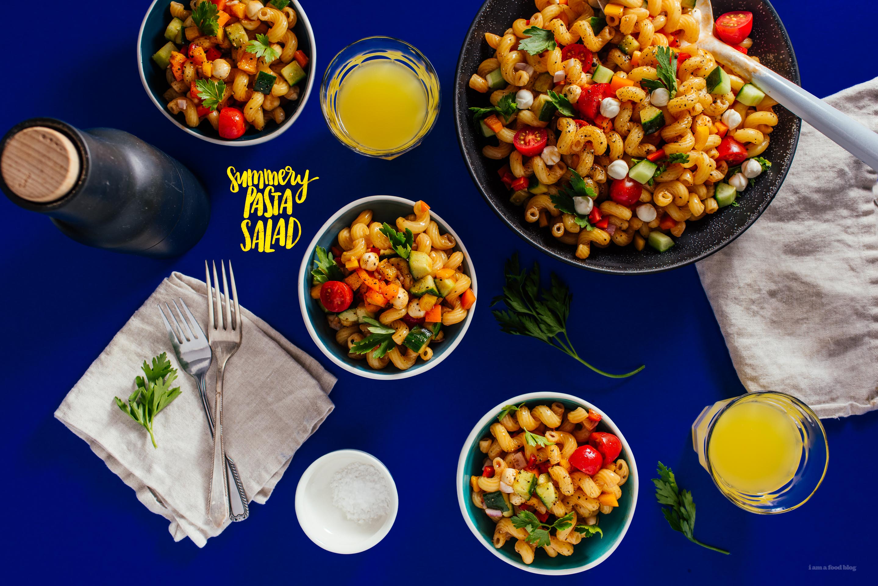 This guy is full of crunchy sweet bell peppers, cucumbers, tomatoes, and my favorite part, baby bocconcini. Sweet and summery, it’s a perfect pasta salad for your next summer get together.