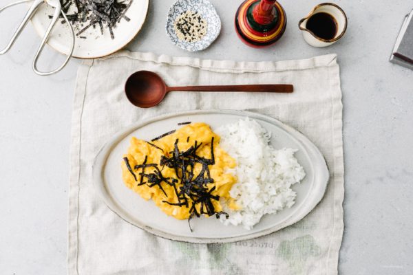 I love soft scrambled eggs. I love tamagoyaki. I love the mutant hybrid of the two: soft scrambled tamagoyaki eggs seasoned with sugar, soy, and mirin. Served on a fluffy bed of rice with nori.