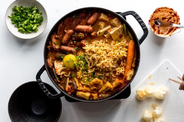 Our take on a popular Korean hot pot dish: budae jjigae, or army stew! A comforting spicy stew with spam, sausages, tofu, mushrooms, and ramen noodles.