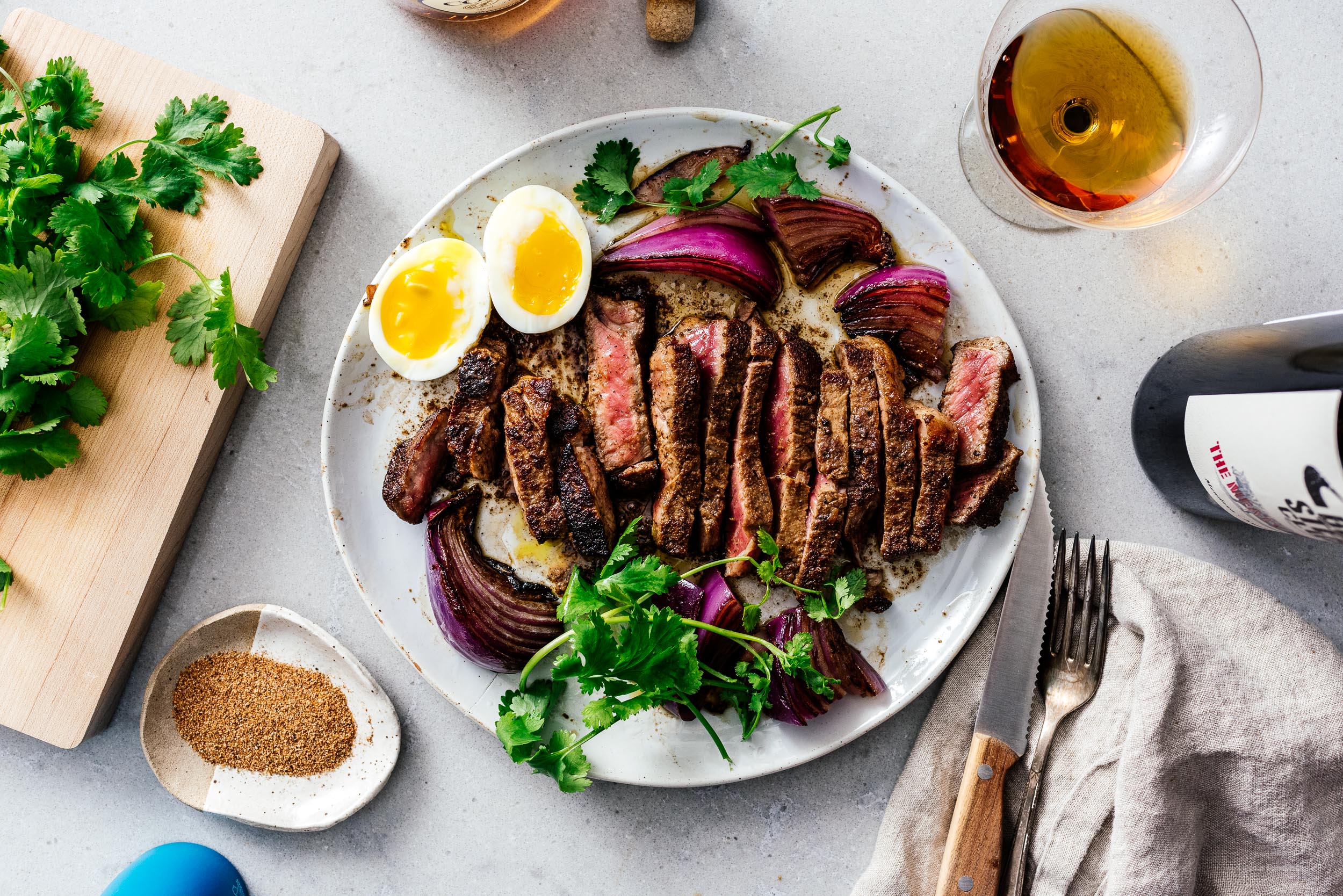 This is a delicious take on chimichurri that Mike came up with that I cannot get enough of. Classic chimichurri is parsley, garlic, olive oil, oregano and red wine vinegar. Mike switched it up for cilantro, garlic, toasted sesame oil, soy, and rice vinegar. Super savory and completely moreish. It’s probably the easiest of the steak sauces to make and the prettiest too because of all the green.
