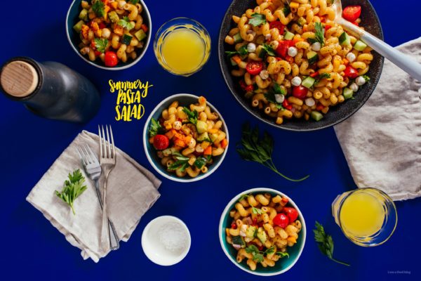 A sweet and summery pasta salad, full of crispy vegetables, tomatoes, and baby bocconcini.