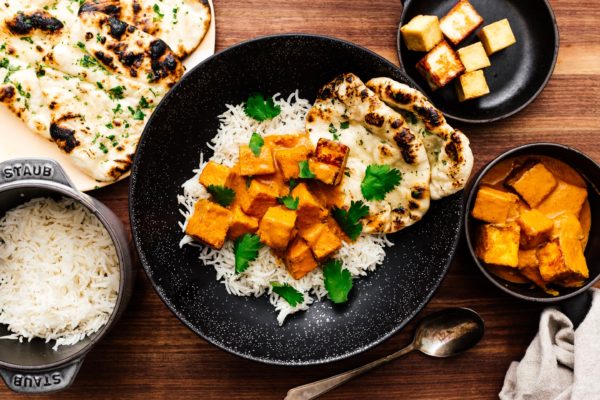 No chicken butter chicken: crispy cubes of tofu and paneer in a makhani gravy butter chicken sauce.